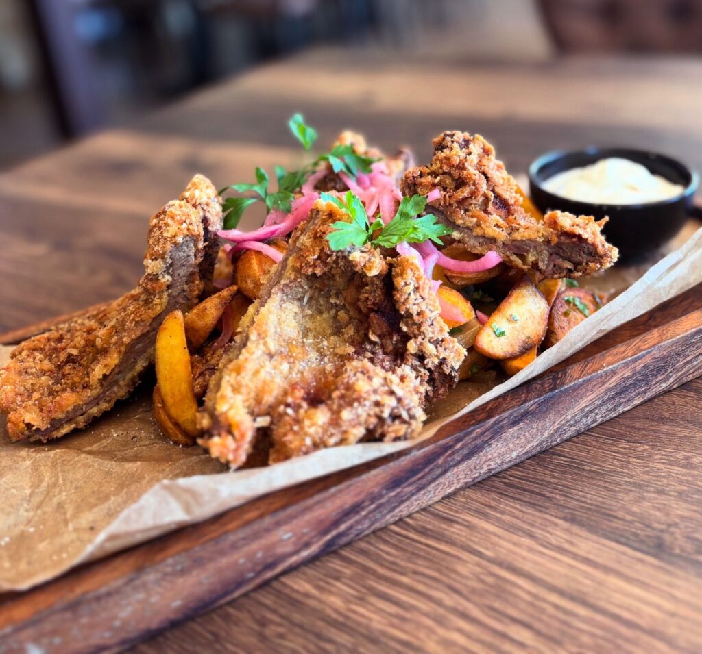 Ez a fogás a klasszikus magyar konyha egyik különlegességét emeli új szintre: a kívül aranybarnára sült, belül szaftos borjúmáj rántva készül, gondosan panírozva, hogy minden falatban ott legyen az a karakteres, mégis elegáns ízvilág, amit csak a borjúmáj tud adni. Mellé ropogós steakburgonya kerül, amit szalonnás, pirított hagymás keverék tesz igazán laktatóvá és ellenállhatatlanná. A füstös majonéz modern csavart ad az ételnek krémes kísérőként tökéletesen egészíti ki a máj gazdag ízét. Ez az étel egyszerre nosztalgikus és újszerű, igazi ínyenc fogás azoknak, akik szeretik a markáns, házias, mégis gondosan komponált ételeket.
