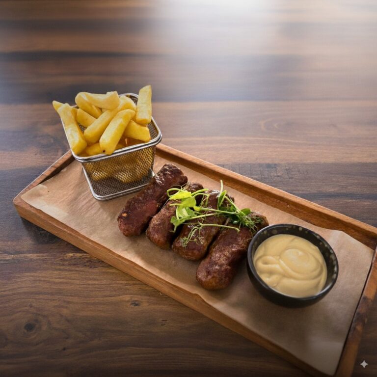 A Székely miccs a hagyomány és karakter tökéletes találkozása: háromféle hús – sertés, marha és bárány – mesteri arányban keverve, gazdagon fűszerezve erdélyi recept alapján. A húsmasszát gondosan formázzuk, úgy sütjük hogy kívül enyhén ropogós, belül pedig szaftos és omlós maradjon. A hozzá kínált ropogós hasábburgonya remekül ellensúlyozza a miccs gazdag, fűszeres ízvilágát, míg a klasszikus mustár pikáns kiegészítőként emeli ki az étel karakterét. Ez a fogás egyszerre idézi meg a határon túli ízeket és kínál modern, éttermi élményt – kötelező választás azoknak, akik szeretik az autentikus, húsban gazdag ételeket